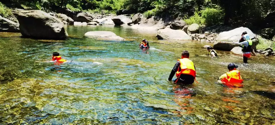 Wade through the stream and explore upstream, passing through numerous natural landscapes, waterfalls, Tianqing Pond, Tiaojian Pond, and Bingwen Pond, where you'll become one with nature. Fenghuang Rock, Guta Rock, Xuande Rock, and Chaotian Rock are nestled among verdant mountains and lush waters, creating a picturesque scene.