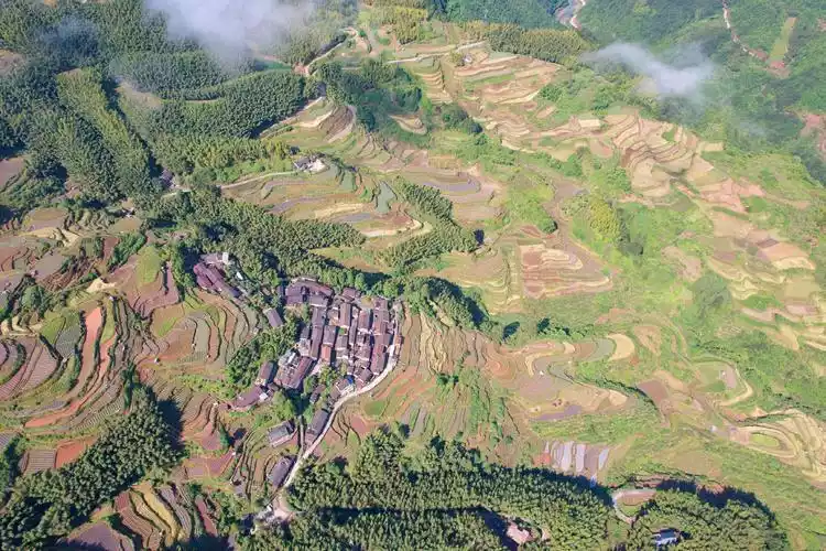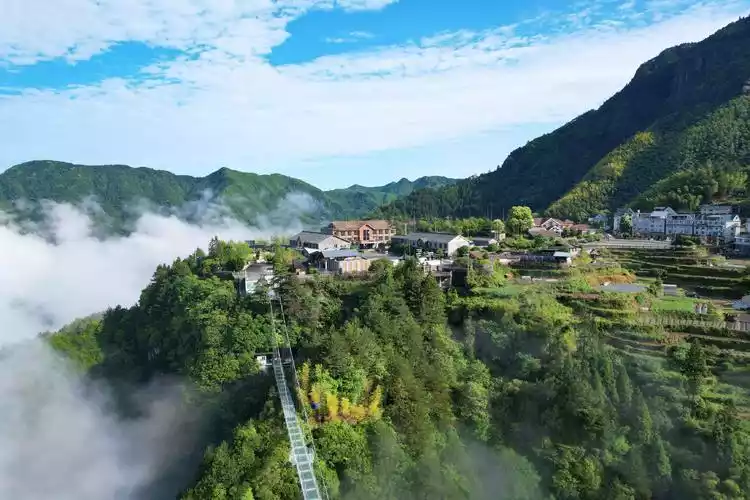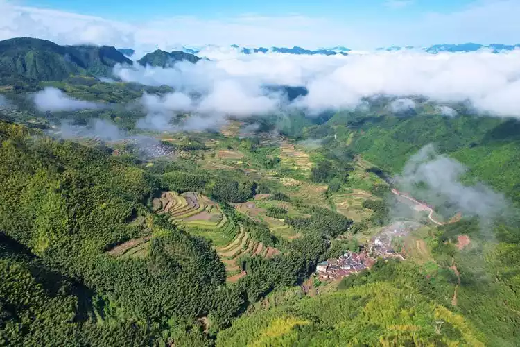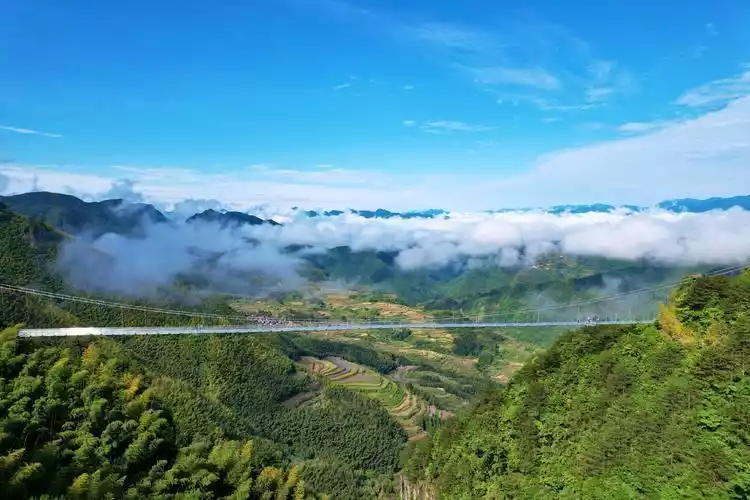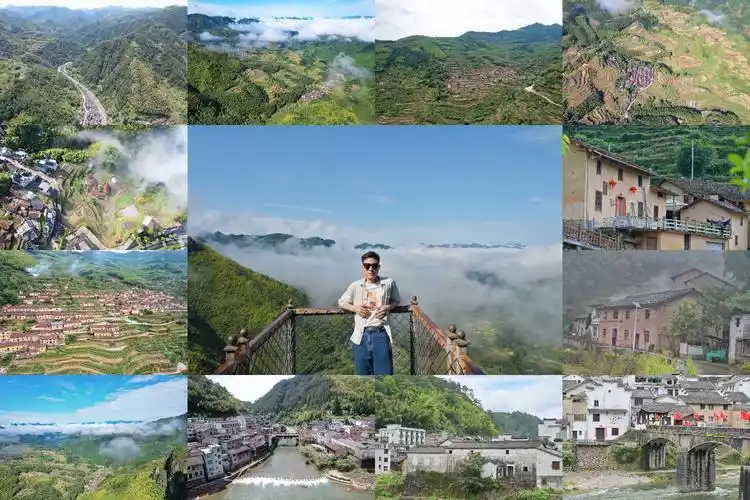Sea of clouds, terraced fields, mountain houses, high-altitude glass viewing bridge, southern Zhejiang houses with earth, mud walls and tiled structures, winding mountain roads, covered bridges, waterfalls, red culture, etc.
