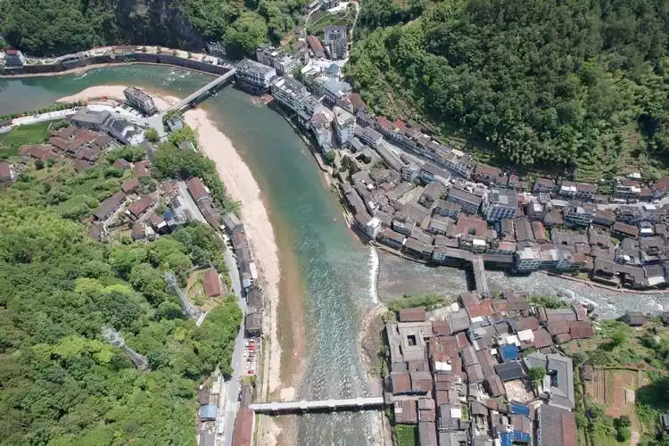 Aerial photography of Wangcunkou Town reveals a picturesque scene, with a river sandwiched between two mountains and an ancient town nestled in the middle. Other notable attractions include the 1935 Cultural and Tourism District, Jiefang Bridge, the ancient residential buildings on the old street, and the Red Book Bar.