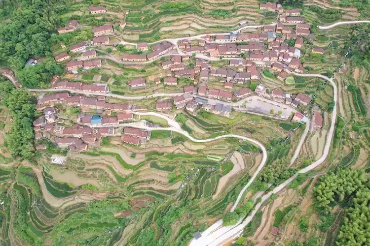 Dake Village, located at an altitude of 560 meters, is built on the mountain. Houses with yellow walls and black tiles, which are characteristic of southern Zhejiang, stand in the mountains. Together with the stacked terraces, it looks like a "golden Potala Palace".