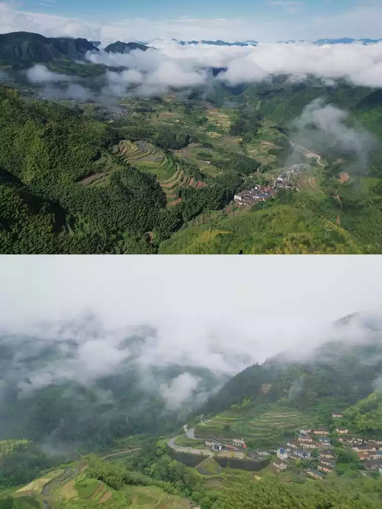 It is difficult to describe the scenery of Nanjian Rock after the clouds and mist have parted. The clouds and mist gradually dissipated, revealing the layers of terraces and ancient villages in the distance. Looking up, there is a sea of clouds again, and in the near distance, there are twin peaks piercing the clouds.