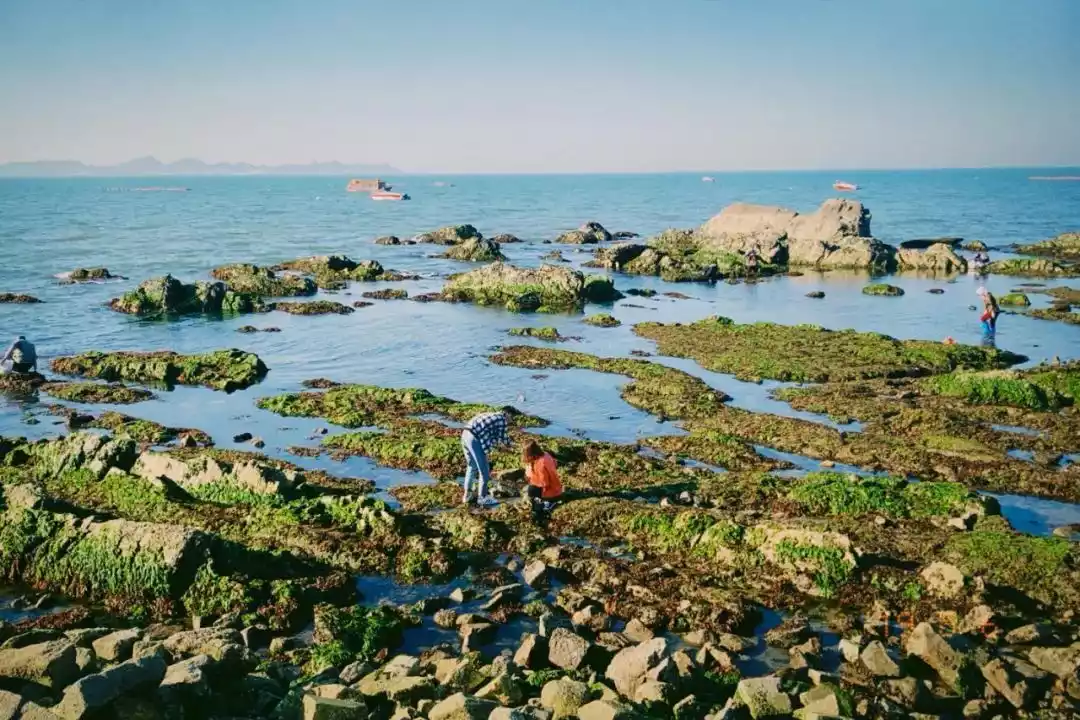 A jade-colored rock beach stretches across the Dengzhou Strait, with Jiuzhang Cliff appearing and disappearing amidst the waves, offering the most beautiful spot for watching the sunset. Beichangshan Island's reef landscape is quite spectacular, with Moon Bay, located at the eastern end, being the most famous.
