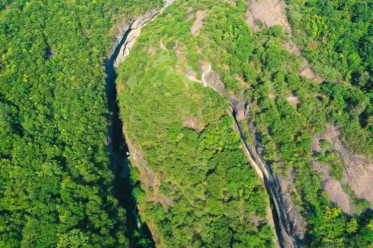 Driving along the Dabie Mountain Scenic Byway, we arrived at the Wanxi Great Rift Valley Scenic Area in Lu'an, Anhui Province. From the air, the rock formations resemble a towering mountain split in two by a divine axe, with cliffs on either side towering over the sky, and a winding 2-kilometer-long stone staircase running down the middle. Visitors can ascend the stone steps and glimpse the wonders of nature, a truly remarkable experience.
