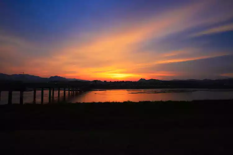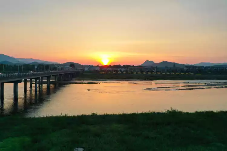 In the evening, the sun slowly set. We drove along the Dabie Mountain Scenic Road to Huoshan County, Lu'an. We happened to encounter sunset and parked the car next to the Heishidu Bridge. A brilliant ray of light appeared on the horizon. In an instant, the sky was dyed deep red, like a magnificent red ocean. It was very spectacular. At this time, it was like a huge red peony blooming in the sky, emitting its fragrance and beauty.