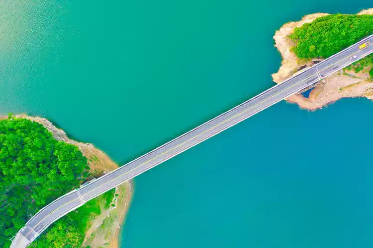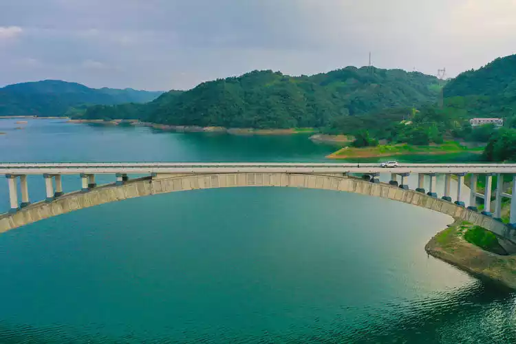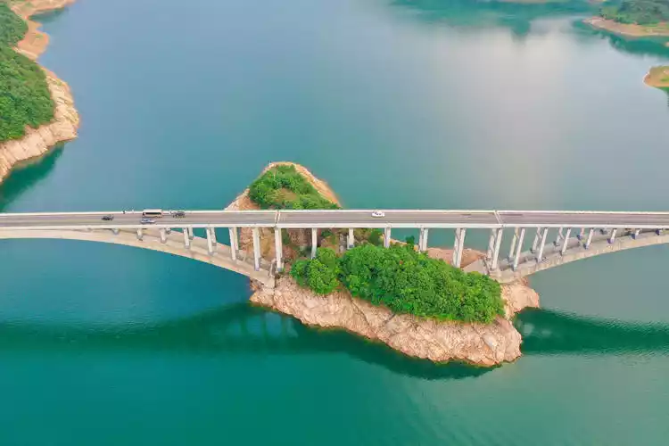 Driving along the Dabie Mountain Scenic Byway, we arrived at the Jinzhai Jintao Bridge in Lu'an, which spans the Meishan Reservoir. In the evening, the sun set, shining on the surface of the reservoir. A boat slowly sailed across the water, creating ripples on the surface. The Meishan Reservoir is located in the Meishan urban area upstream of the Shi River. The artificial lake formed by the Meishan Reservoir is crystal clear and picturesque from the air.