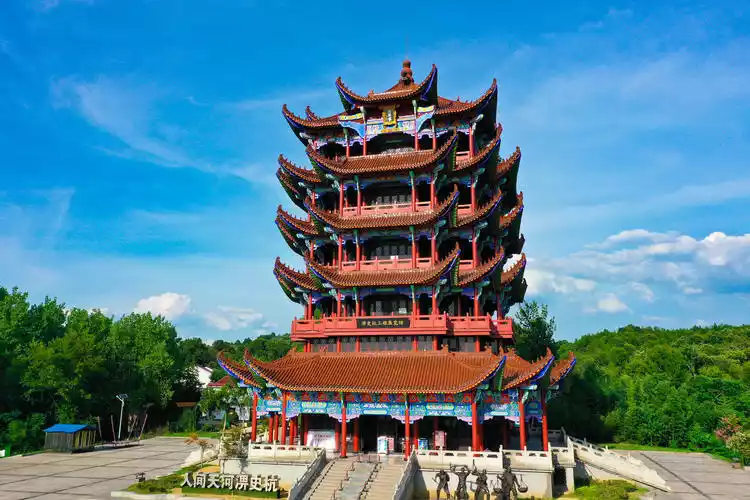 Driving to Qingyuan Tower, the Pi River lies in front of the building. The scenery here is picturesque. From the air, the Pi River is shaded by trees. In front of the building, there are lifelike statues depicting the working conditions of the Pi River Water Conservancy Project. Western Anhui has been plagued by disasters since ancient times. This is related to its mountainous terrain.
