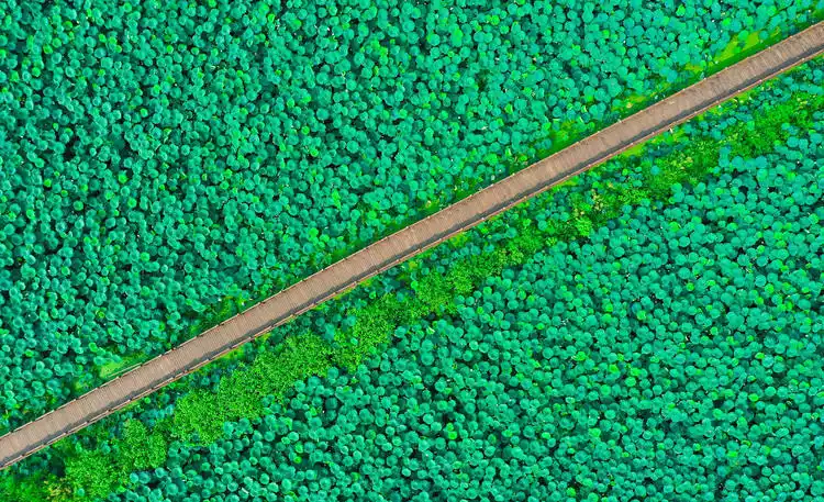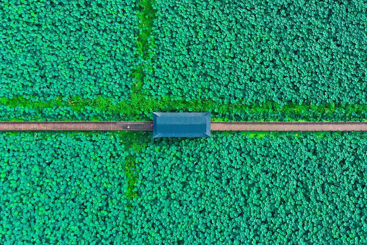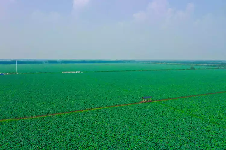 After driving 800 kilometers along the Dabie Mountain Scenic Road, I arrived at the 10,000-acre Lotus Garden at West Lake in Huoqiu County, Lu'an. The aerial drone view was truly breathtaking: 10,000 acres of lush green lotus flowers, their leaves woven into a single color, and hibiscus blossoms spreading out to either side of the face. The graceful lotus blossoms, in full bloom under the scorching summer sun, vie with each other for splendor. The captivating charm of the water and the intoxicating fragrance of the lotus create a beautiful and unique summer scene.