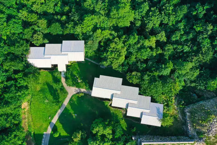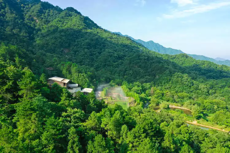 The entire complex is designed to follow the terrain, retaining its original appearance, utilizing nature and creating a staggered layout. The entire villa is located halfway up the mountain. From a drone's perspective, the entire resort is surrounded by mountains on three sides and is covered by trees, making it a much cooler place to escape the scorching summer heat.