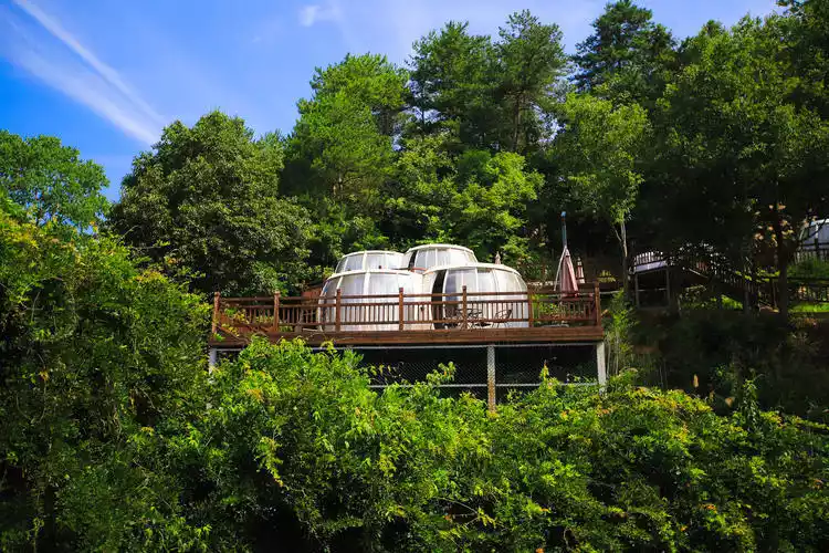 Dabie Mountain Villa Resort is located at Baimajian, the main peak of Dabie Mountain, at an altitude of 950 meters. We drove here on the day of the Dabie Mountain Scenic Road and stayed there. It felt like we had come to a paradise, far away from the hustle and bustle of the city. The buildings here are built against the mountain, so what we see here is the integration of buildings and natural objects, with trees passing through the roof, stones growing from the walls, and water flowing from the house.