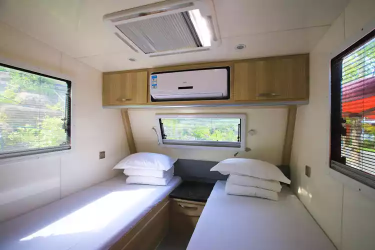 There are currently 9 trailer RVs in the camp, which are equipped with different room types for different customer groups, including deluxe rooms, bunk beds, standard rooms, and couples' rooms. Each RV is equipped with an independent courtyard for tourists to barbecue by themselves, and barbecue utensils are provided free of charge. It is very close to the Dabie Mountain Scenic Road and is a resting place during self-driving trips. In the evening, you can sit in front of the RV with your family to barbecue, eat delicious food, drink tea and chat, and watch the twinkling stars in the sky at night.