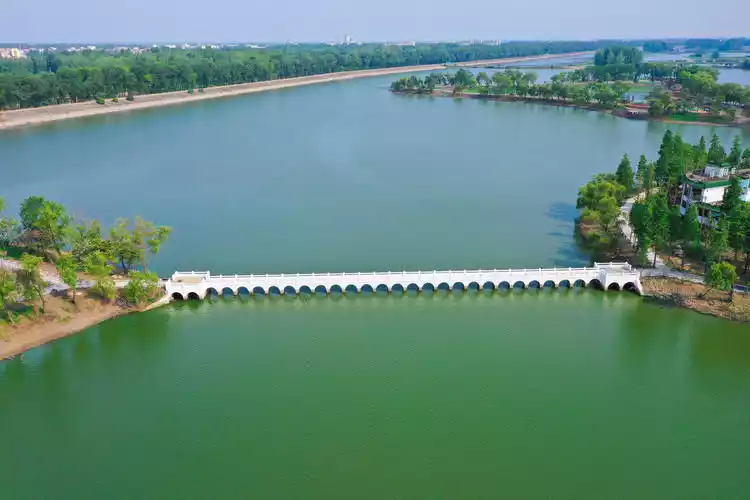 Shuimen Park, originally an ancient pond, was transformed into a reservoir after the founding of the People's Republic of China, and a park was built on its foundation. The reservoir holds 10.4 million cubic meters and features 46 islands connected by winding bridges. Visitors can stroll across the bridges and enjoy the scenic beauty of the islands, each with its own unique character. Flanking the long bridges are pavilions, towers, lush forests, bamboo groves, and vibrant flowers and birdsong, earning it the nickname "Thousand Island Lake" of western Anhui.