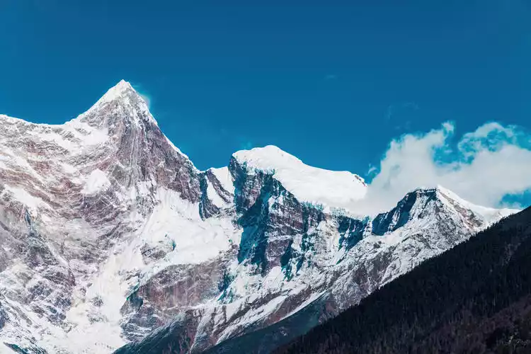 The Midui Glacier is formed by the confluence of world-class icefalls, each over 800 meters high and 1,000 meters wide. A primeval forest stretches between the two cascades. The main peak of the Midui Glacier is 6,800 meters above sea level, while the snowline is only 4,600 meters above sea level. The lower reaches of the glacier are nestled in a mixed coniferous and broad-leaved forest.