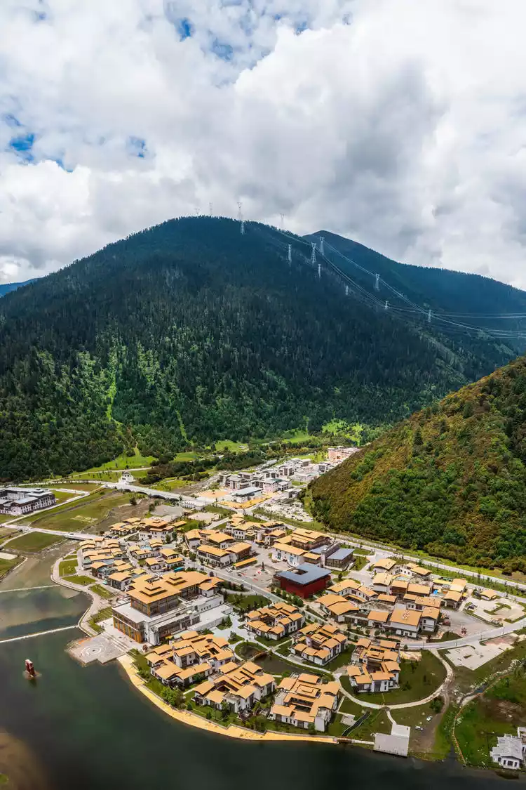 The lush green of the young forests and the tranquility of the mother forests, along with the towering snow-capped Namjagbarwa, complement the forested landscape, further highlighting the majestic grandeur of the Tibetan Plateau. Strong Tibetan-style dwellings and buildings that blend Tibetan, Han, and Monpa ethnic characteristics are neatly dotted among the alpine pastures, creating a tranquil and peaceful atmosphere.