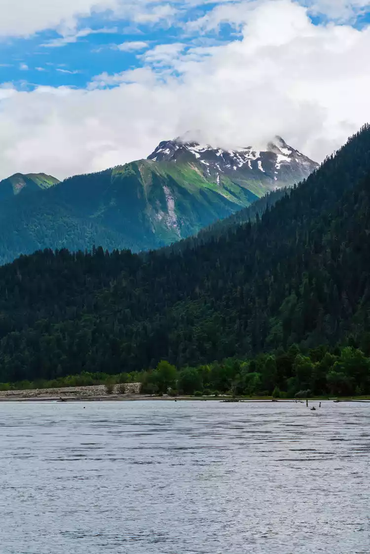 Driving from Linzhi to the Yarlung Zangbo Grand Canyon, we passed the Niyang River Scenic Area, Benri Sacred Mountain, and Buddha Palm Sand Dunes along the way. We made a brief stop at the Niyang River Scenic Area and Benri Sacred Mountain.