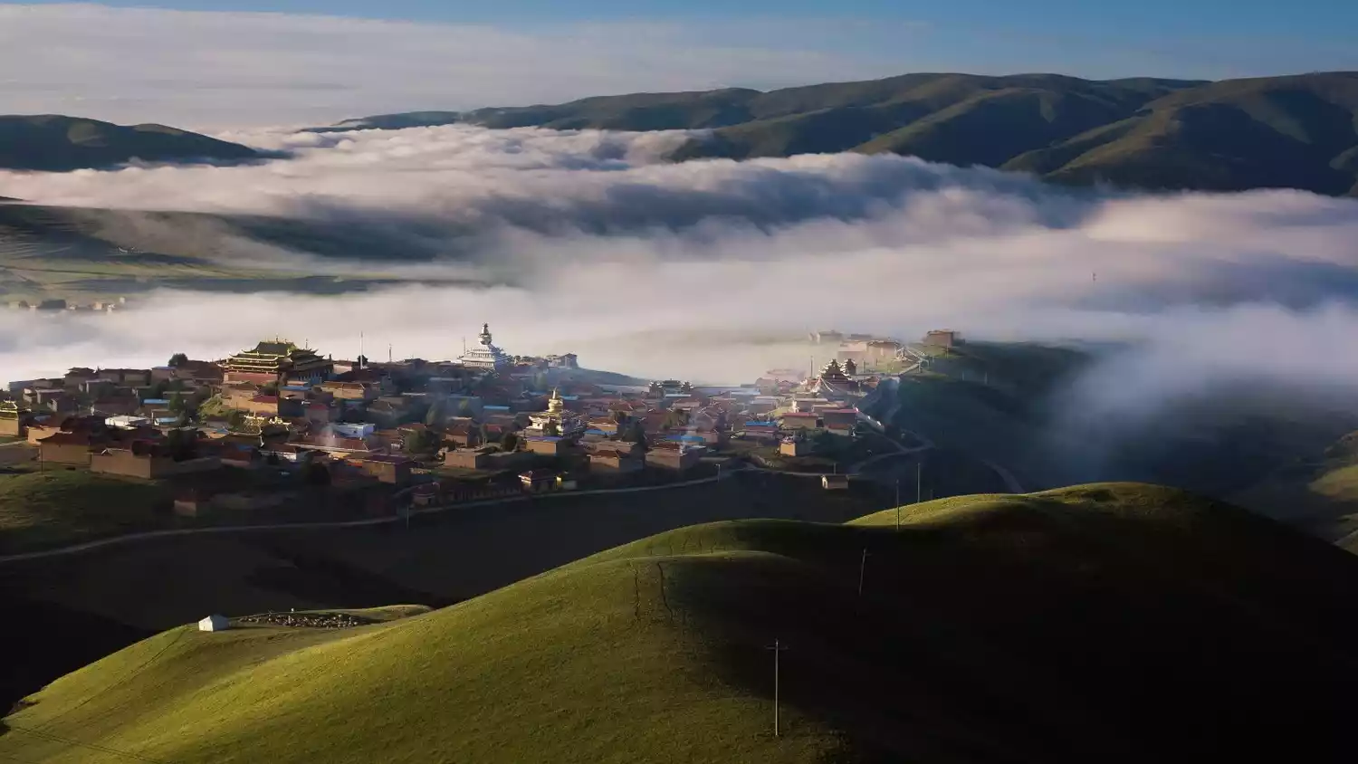 The Buddhist temple is magnificent under the sunlight, the sound of chanting is endless in the magnificent temple, prayer flags all over the mountain are fluttering in the wind, climbing up the mountainside along the prayer wheels. Outside the temple, tents are dotted on the boundless grassland, herds of cattle and sheep, and smoke curls up, merging with the Yellow River to form a magnificent picture.