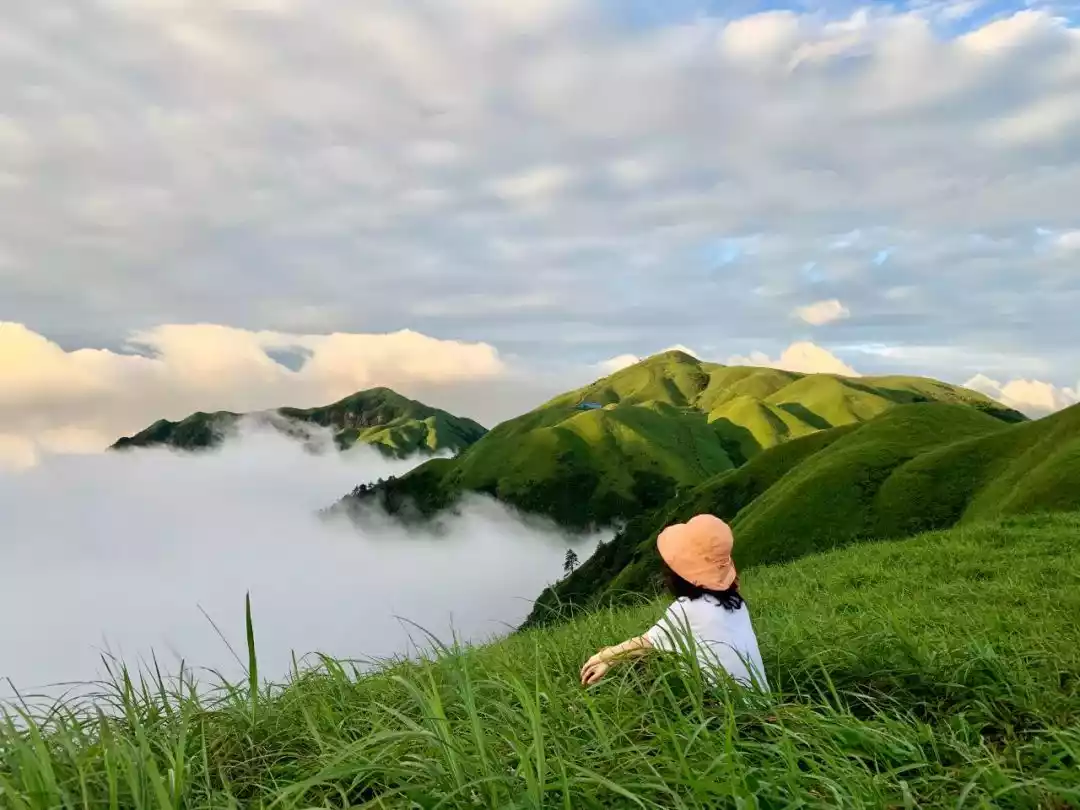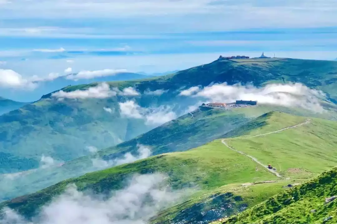 Wugong Mountain, with an average elevation of over 1,600 meters, boasts 100,000 mu (approximately 1,000 acres) of alpine meadows. Stretching across the peaks, the meadows pierce through the clouds and mist, leaving the pristine sky a backdrop of rolling hills. The lush greenery is truly breathtaking!