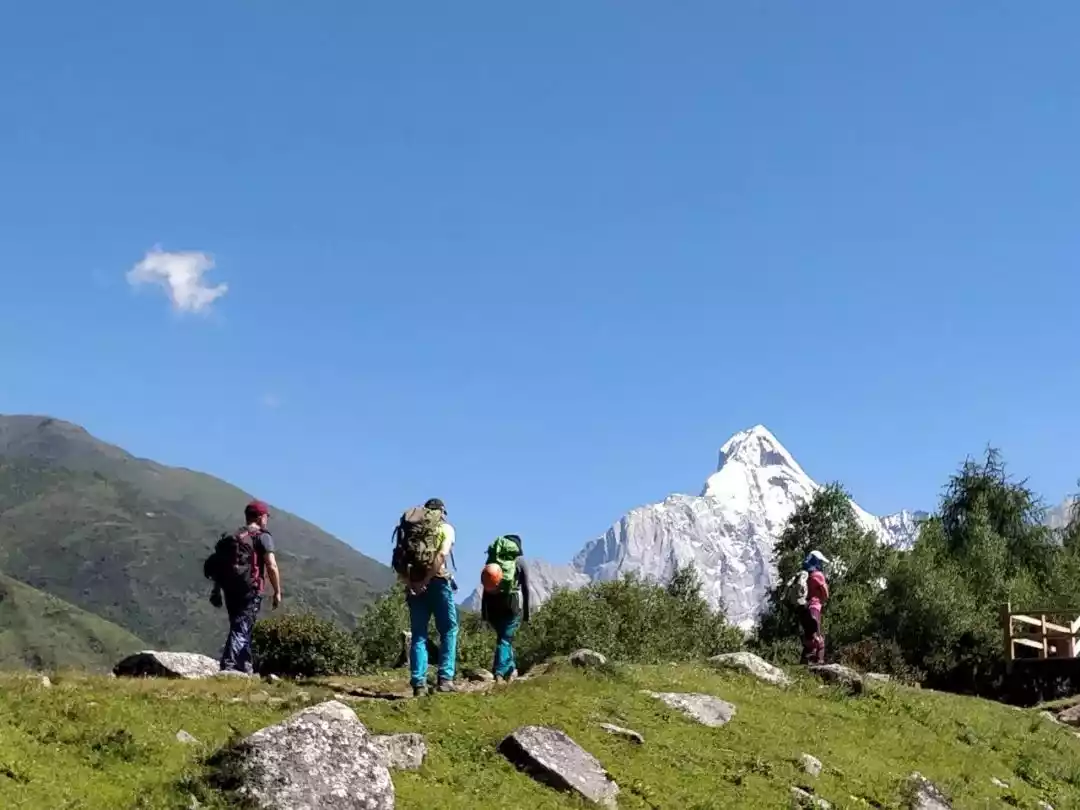 The approximately 40-kilometer-long route through Bipenggou has a first section at the foot of Yaomei Peak, a middle section beneath snow-capped peaks such as Yangmantai and Luotuo Peak, and a final section crossing the Chazigou Pass into Bipenggou. The scenery changes at every step, and the charm of the "Chinese Alps" is in full view.