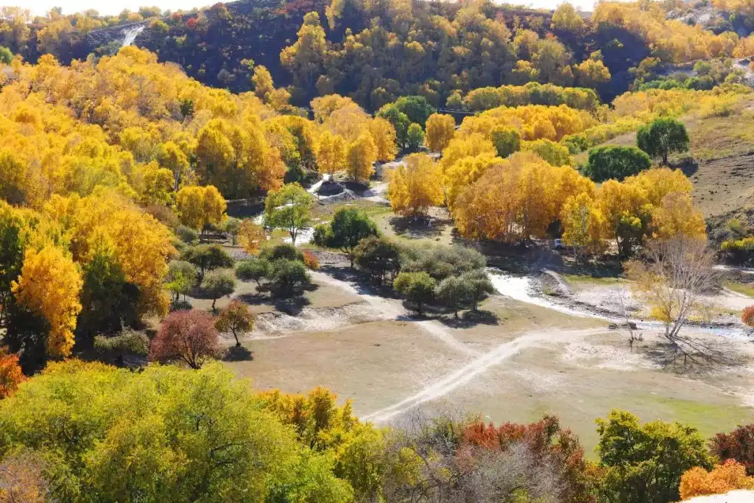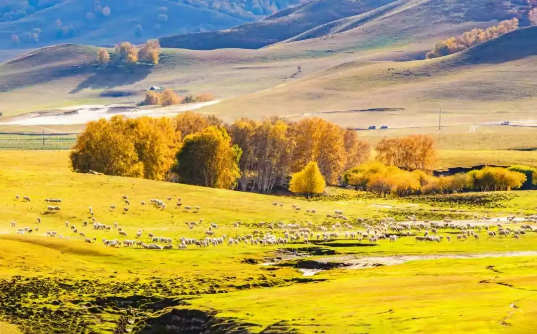 In September, the Ulan Butong Bashang Grassland is awash in autumn colors, with crimson leaves blanketing the hills and layers of lush green forests. Golden birch trees line the meadows, galloping horses and flocks of sheep scattered like pearls, creating a vibrant canvas of rich ink and light colors.