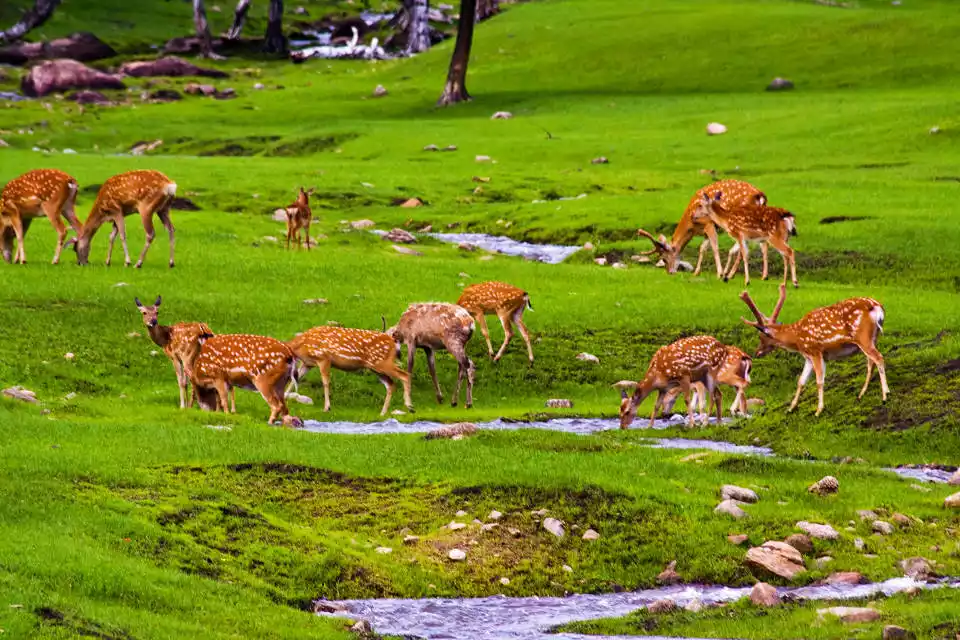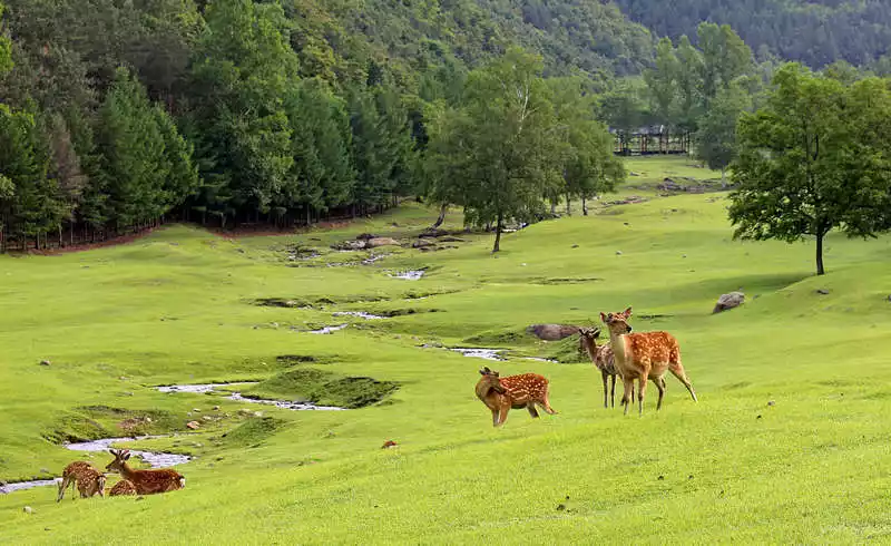 In the autumn, Jinshan Deer Park is shrouded in clouds and mist, with colorful forests and golden pastures. Occasionally, a group of elegant sika deer run lightly out of the forest, and we feel like we have strayed into a fairy tale world.
