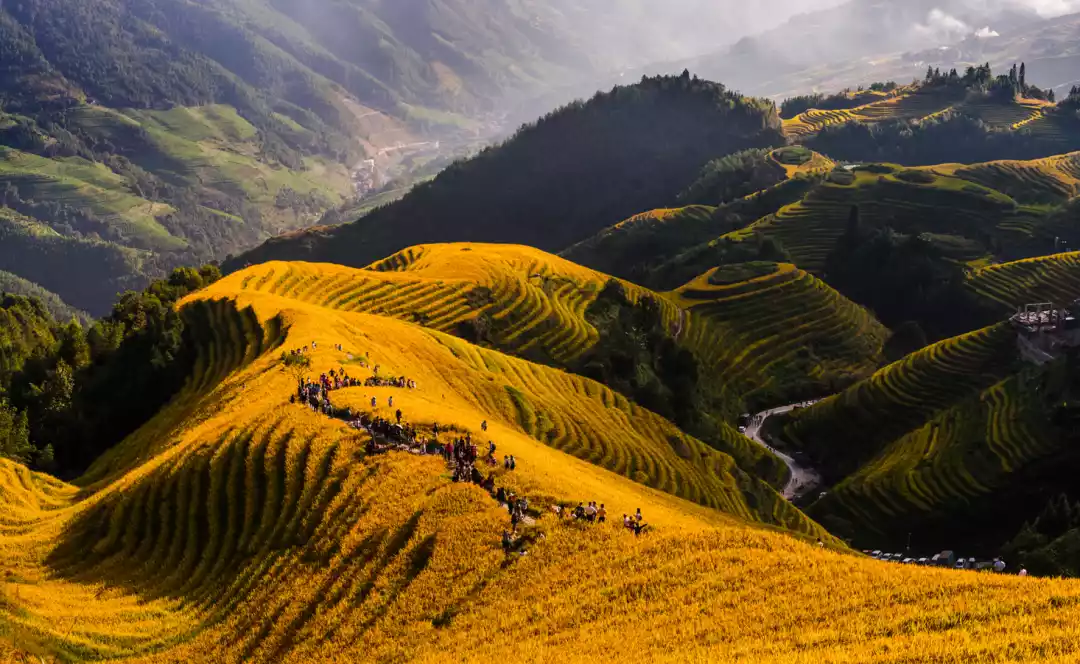 Especially during the autumn harvest season in late September, this place becomes a photographer's paradise, with golden rice fields covering the mountains and fields, creating a unique atmosphere.