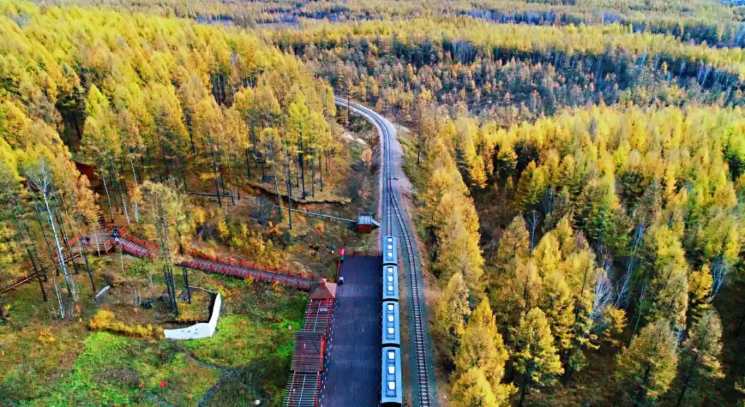 The light blue sky is hung with a few soft white clouds, there are endless orange-yellow larch trees, and tall and straight white birch trees, with golden yellow leaves hanging on the branches. Take the Mordaoga train and head towards autumn!