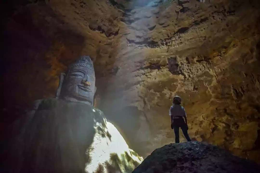 Hidden in Beibei District, Chongqing's main city, Tianyan Cave is a great summer retreat. Even in early autumn, Chongqing still feels as scorching as summer, but the cave is surprisingly cool, with a Buddha statue sitting cross-legged.