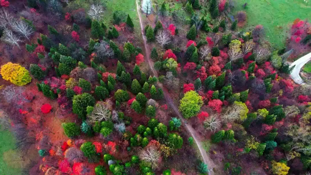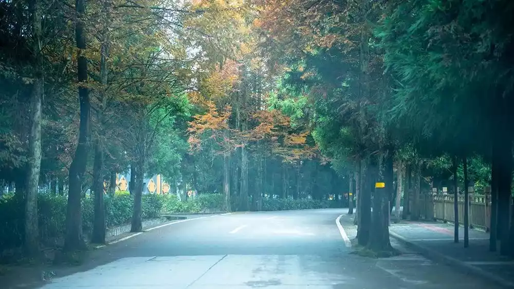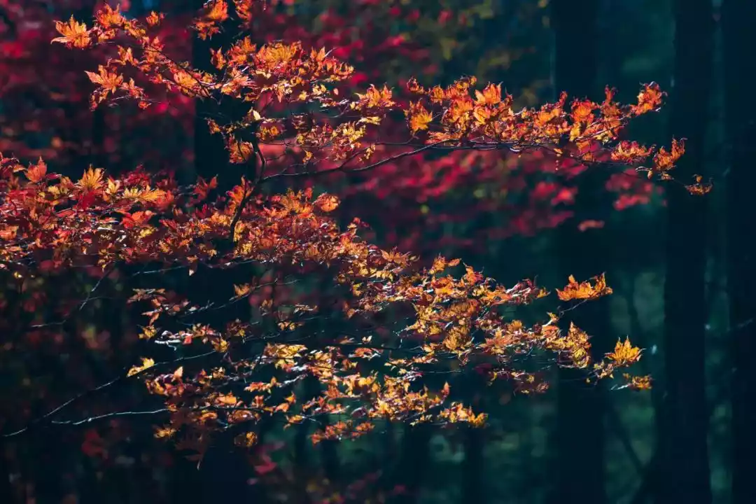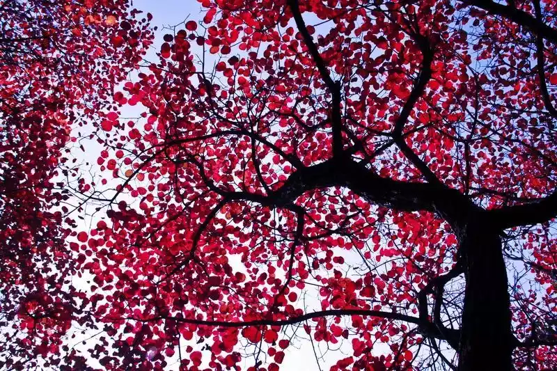 In autumn, when the maple leaves turn red, a visual feast begins. The vibrant crimson maple leaves, golden birch trees, and purple elm trees create a scene that feels like entering a neon-lit fairy tale world.