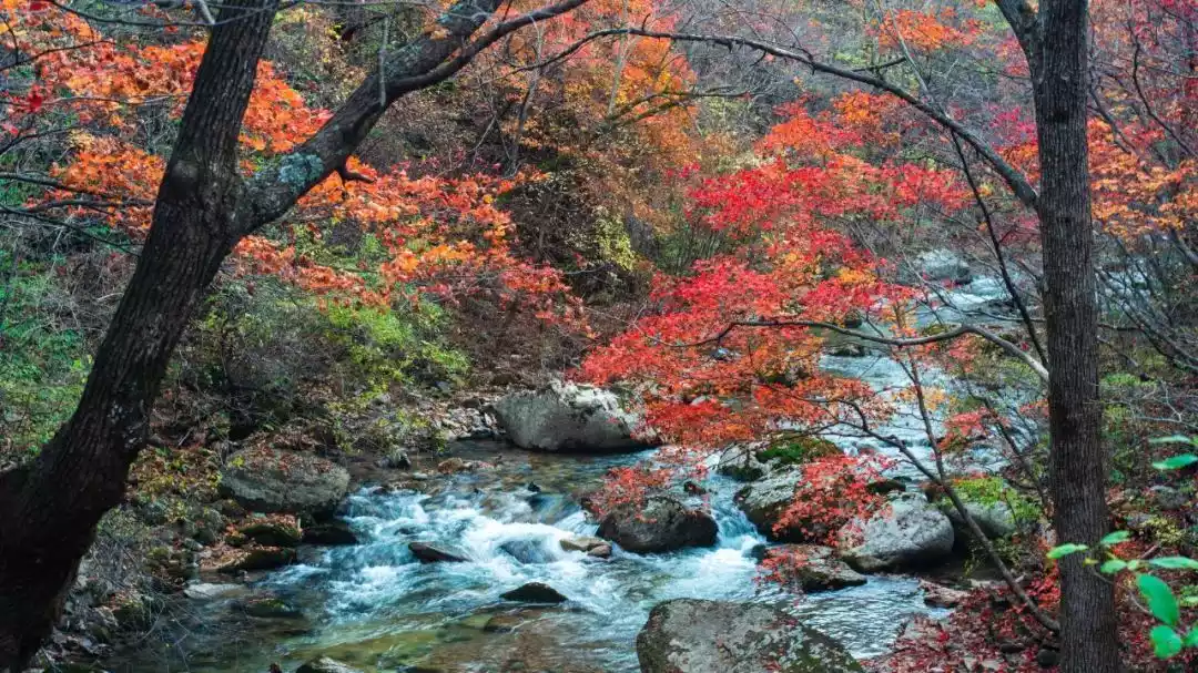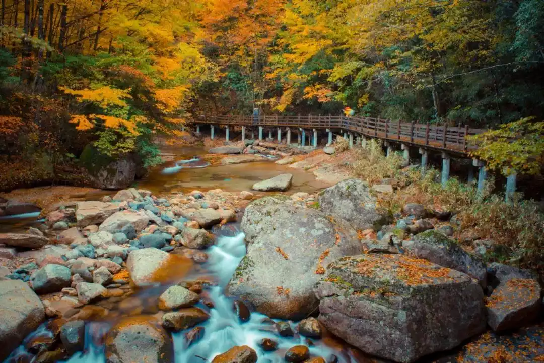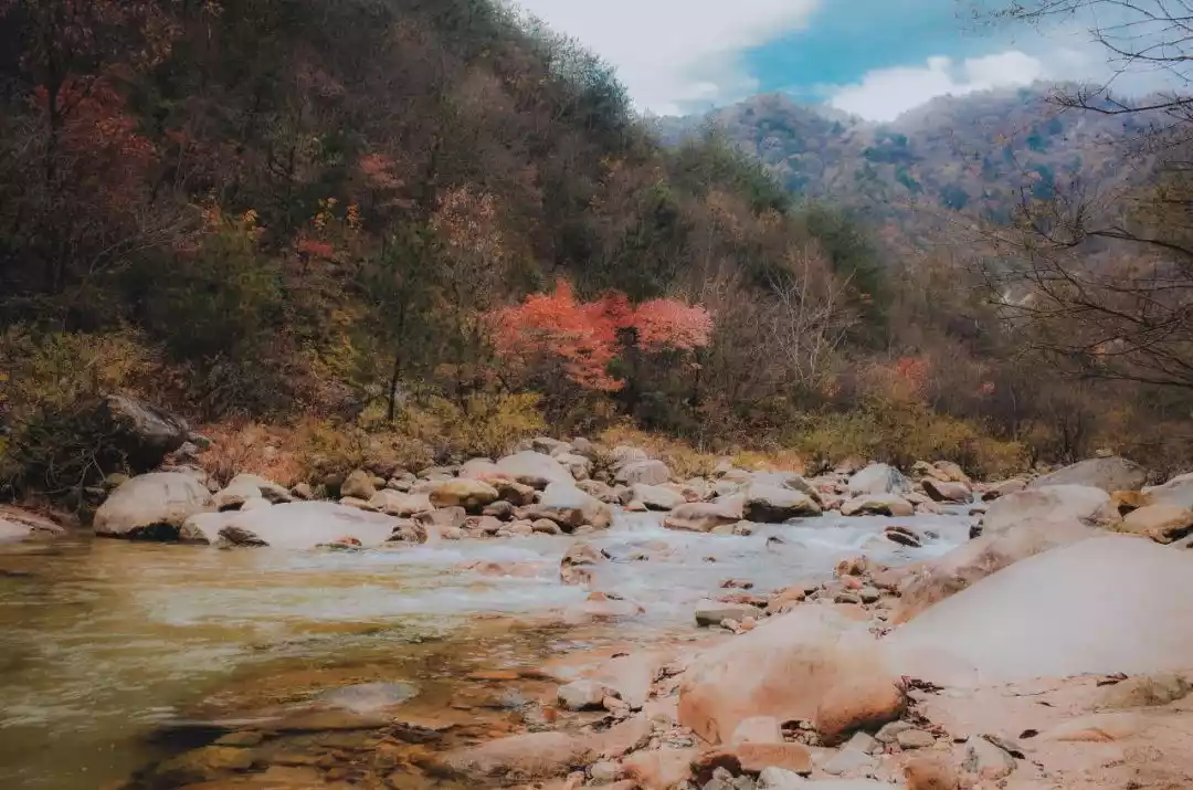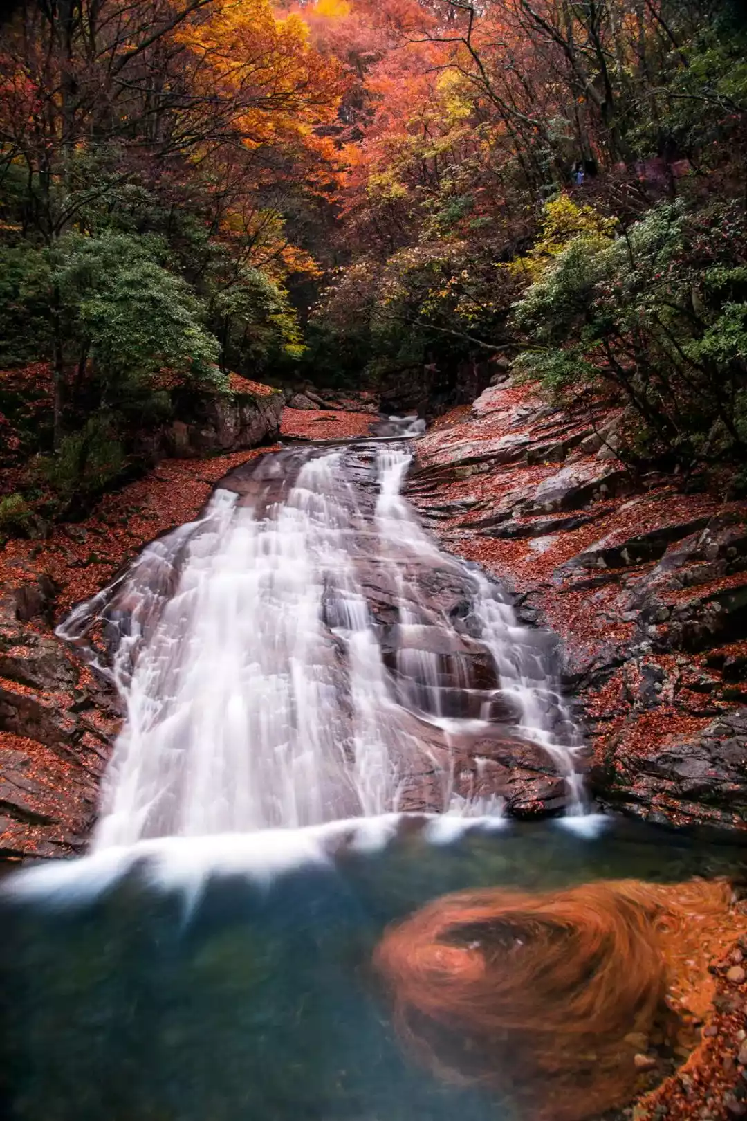 Look at the red leaves swirling on the water, forming a beautiful autumn landscape with the colorful forests on the mountain. Tourists who like to take slow-motion photos of flowing water should remember to bring a neutral density filter to ensure you have a great time!