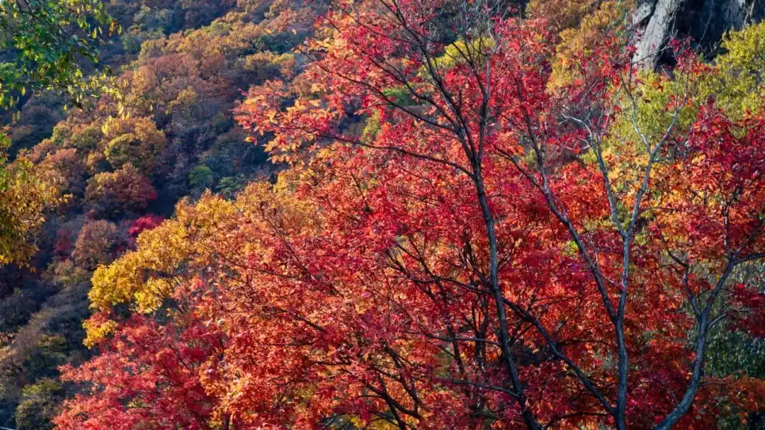 In autumn, a must-see is Guangwu Mountain, known as "China's No. 1 Mountain for Red Leaves." From mid-October to early November, gently kissed by frosty winds and penetrating sunlight, each mountaintop is ablaze with fiery red leaves, a single tree leading the way, echoed by the rest of the mountains.