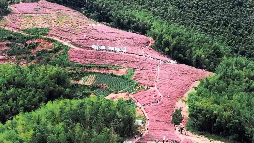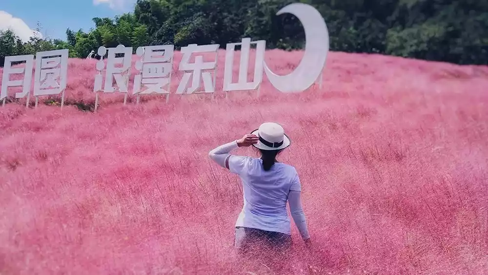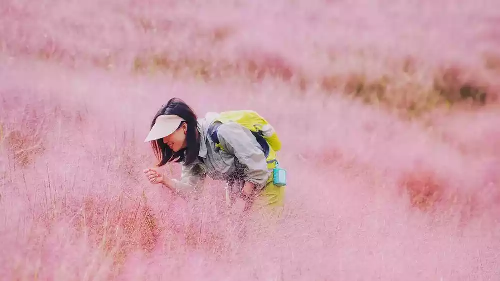 Go up the Yuegong Mountain Ancient Trail, pass through the reservoir and the village, and on the hillside in front of you, 300 acres of pink muhly grass are in full bloom, with pink clouds floating in the wind, clustered together like a sea of flowers.