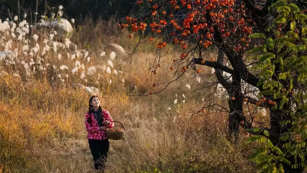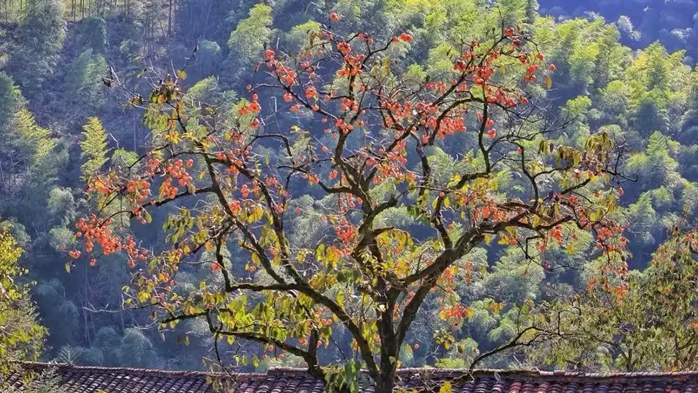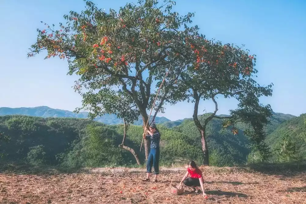 Climbing up the thousand-year-old ancient road in the village, you can see fiery persimmon trees everywhere, between the fields and mountains, in front of and behind the houses. They complement the ancient houses with white walls and black tiles in the village, outlining a picture of comfortable life.