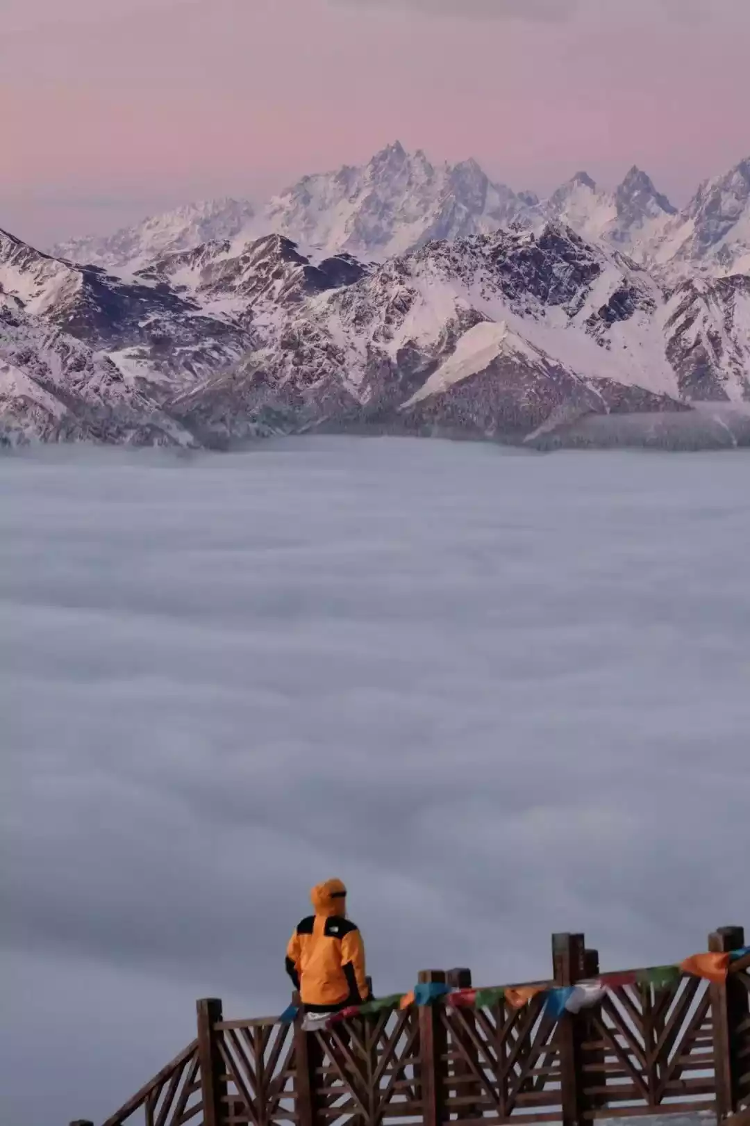 The scenic area offers panoramic views of famous mountains such as the Siguniang Mountain in the north, the Pagla Sacred Mountain in the south, the Gongga Peaks in the west, and the Emei Mountain in the east.