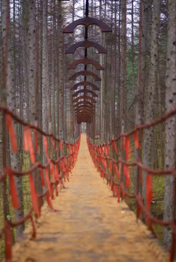 Lover's Valley offers the most romantic scenery in Liuba during autumn. Hundreds of acres of larch trees carpet the area in golden color, while gurgling streams flow through the canyon. Strolling along the wooden path through the woods feels like stepping into a fairytale world.