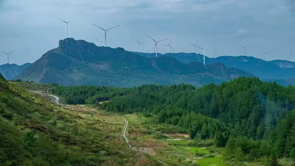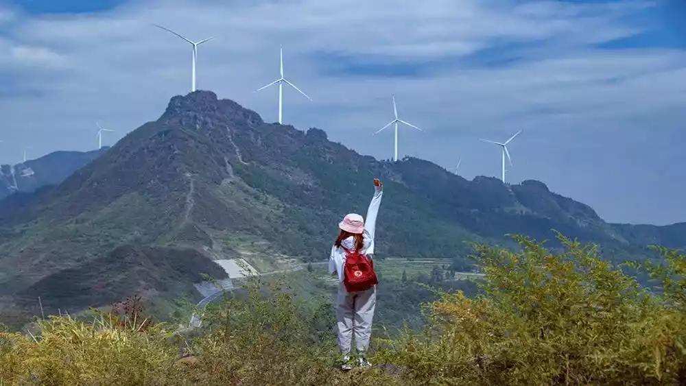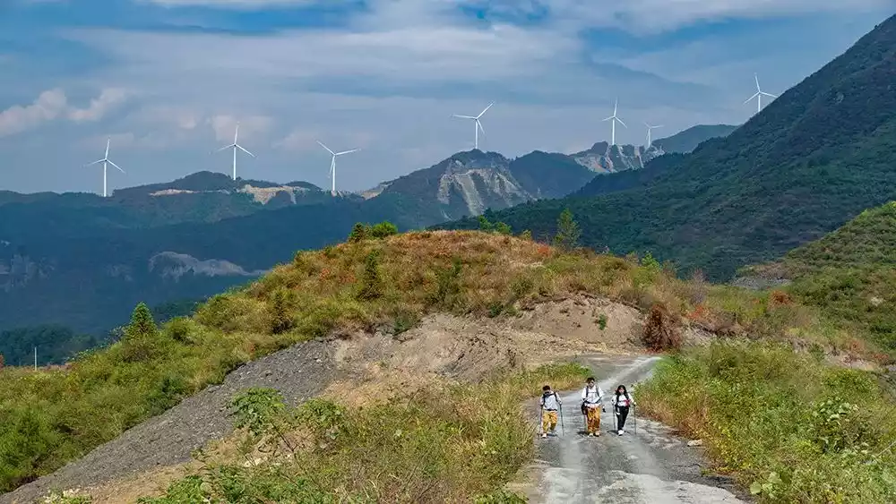 Here, you can experience the pleasant surprise of hiking from the green forest into the countryside, with ancient city walls and villages, tall and lush forest trees, and the air is full of negative oxygen ions. Looking back, the windmills in the mountains complement the mountains.