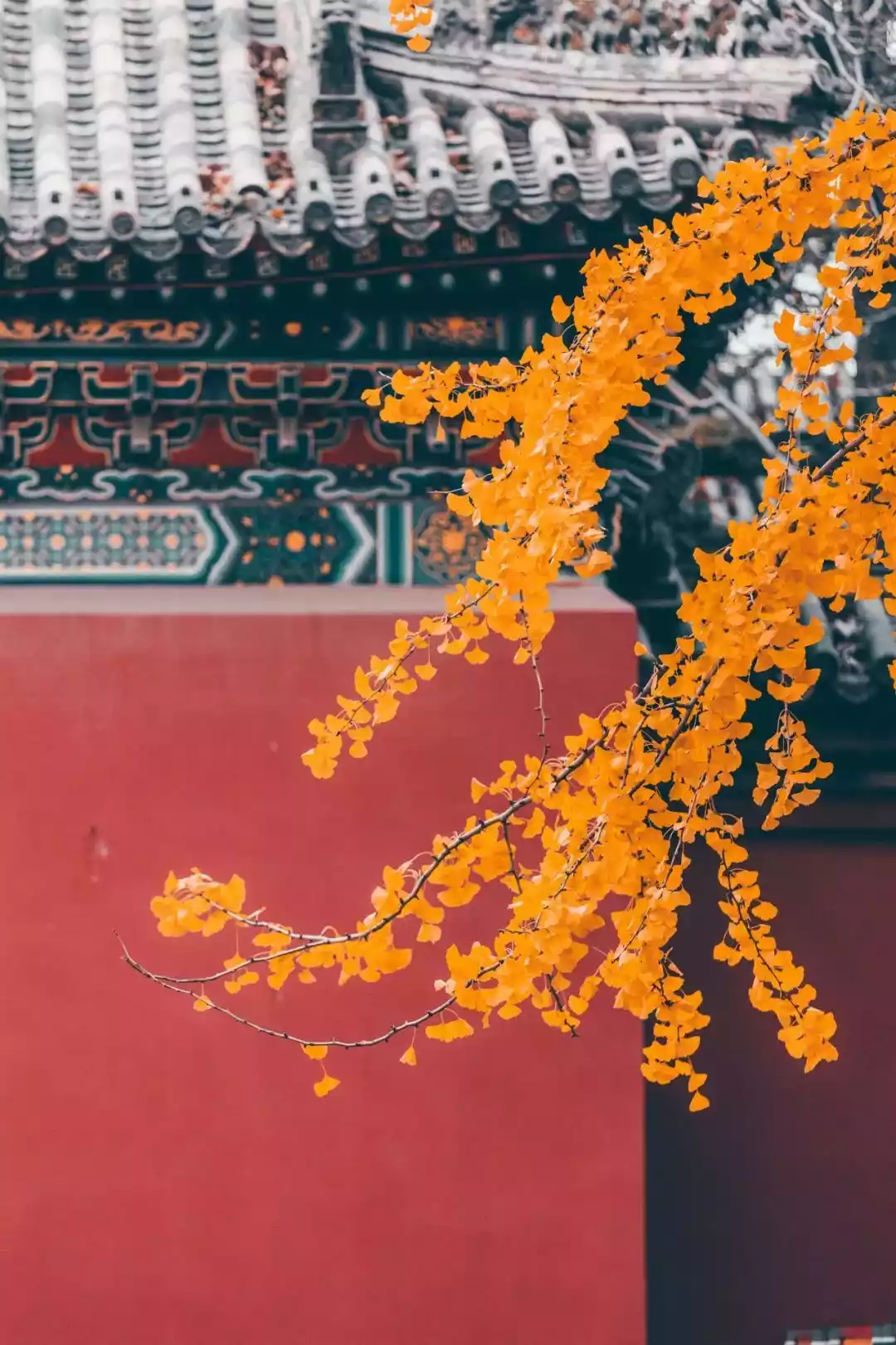 /Golden tiles, red walls, ginkgo leaves, breathtakingly beautiful/