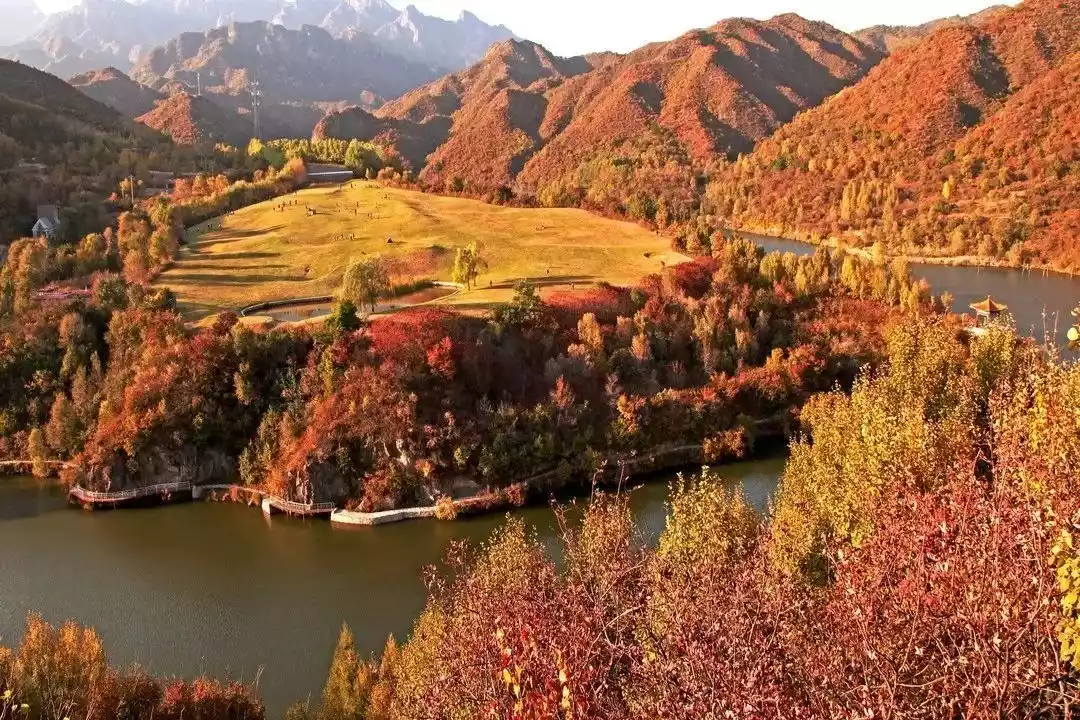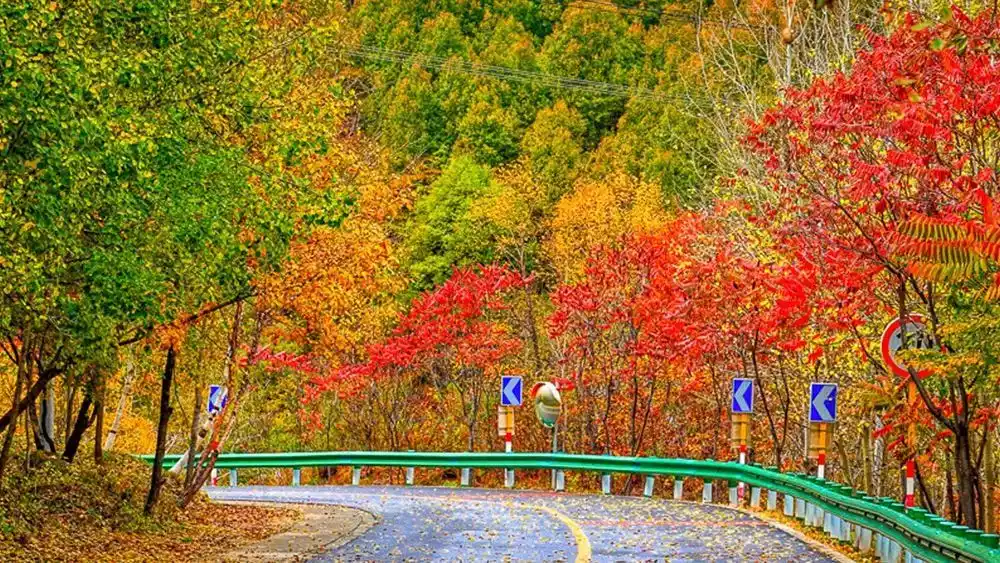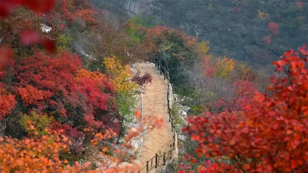 "Red leaves swim amidst the green, colorful streamers dance in the sky." A 6-kilometer circular plank road offers a panoramic view of the crimson leaves covering the mountain. Pofengling has been hailed by National Geographic as "North China's most spectacular red leaf viewing spot."