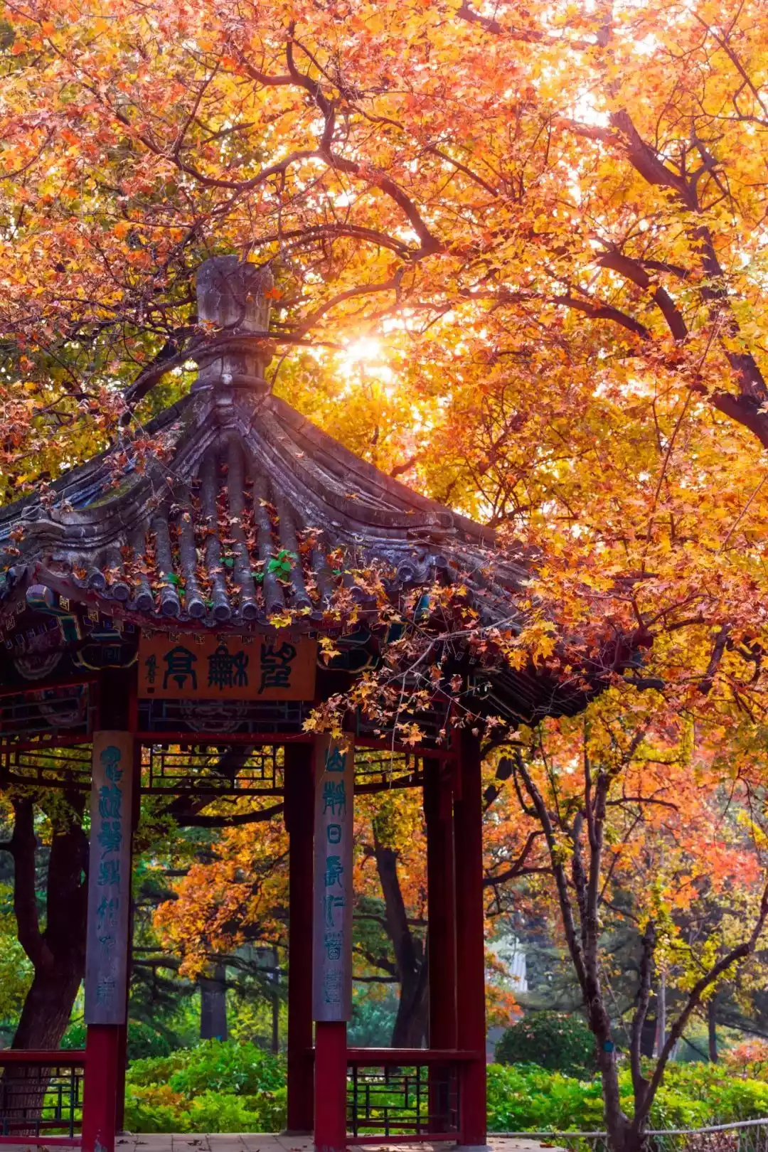 The green tiles and flying eaves, the carved beams and painted buildings, the azure sky and the swaying autumn leaves provoke the passage of time, creating an echo that spans hundreds of years.