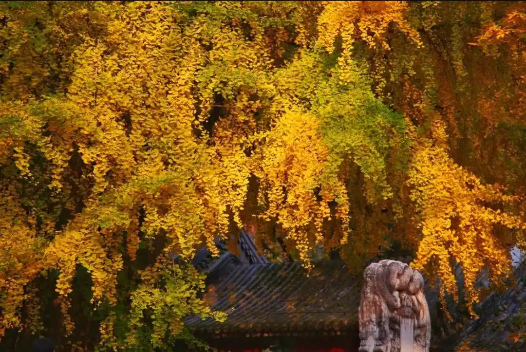 In Shangfangshan National Forest Park, the green gradually recedes, and red appears on the branches. The Ginkgo King dances with his flowing golden hair, and the whole mountain is breathtakingly beautiful.