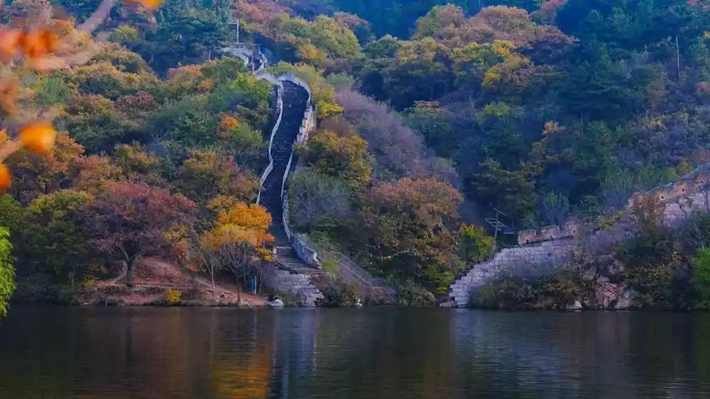 Under the illumination of the red leaves all over the mountains, the lake glows red, and the Great Wall reflects the mottled traces of time.