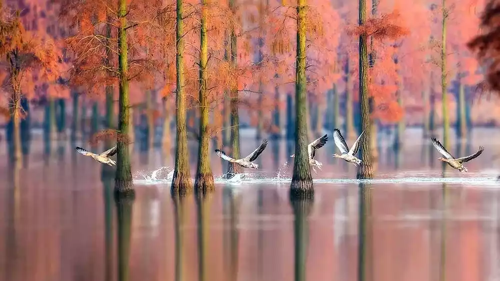 Egrets, herons, geese, grey cranes, hoopoes... More than 20 species of wild birds live here, with thousands of acres of lake surface, tens of thousands of pond cypresses, and tens of thousands of migratory birds returning to their nests.