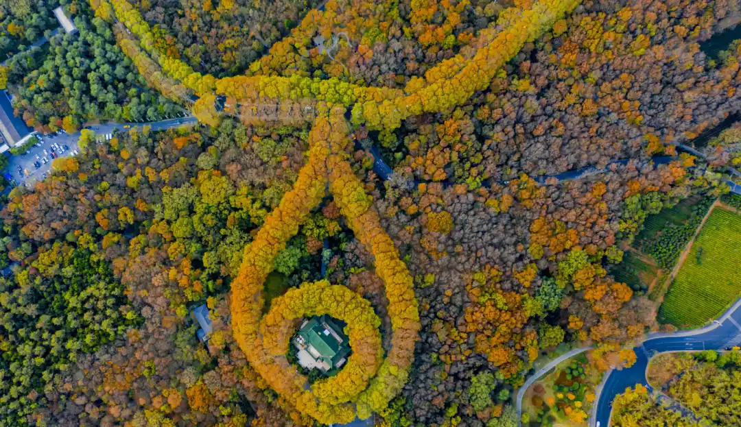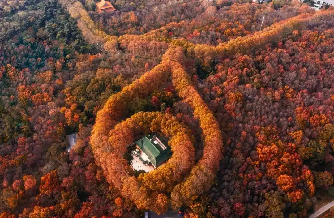 The autumn in Zhongshan Scenic Area is the most unmissable autumn in Nanjing. Here, a colorful "necklace" appears every autumn, which is stunning under the aerial camera. It is the Meiling Palace.