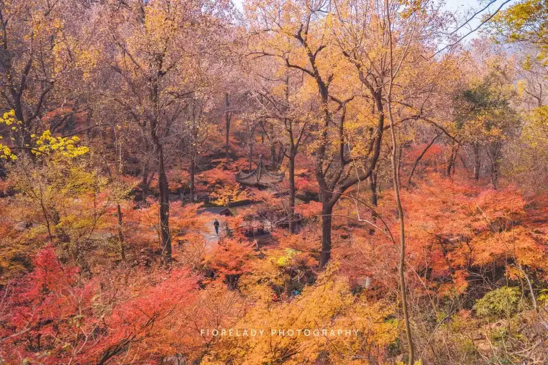 A short walk from the summit to Maple Forest Lake and Red Leaf Valley leads to one of Qixia Mountain's best maple viewing areas. The autumn breeze sweeps through the authentic maple forest, and the lake beneath shimmers with ripples, creating a breathtaking beauty.
