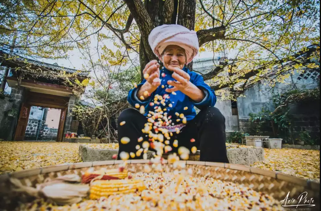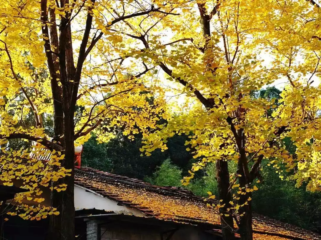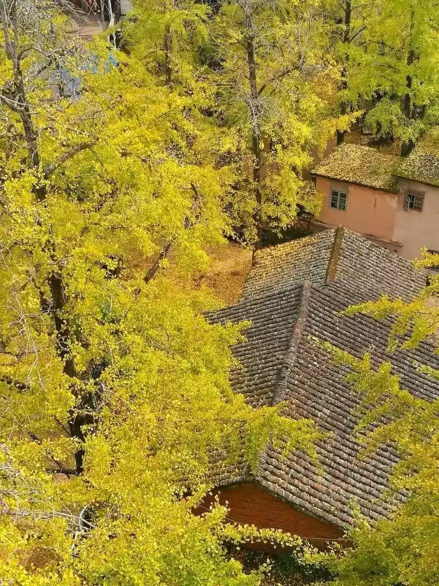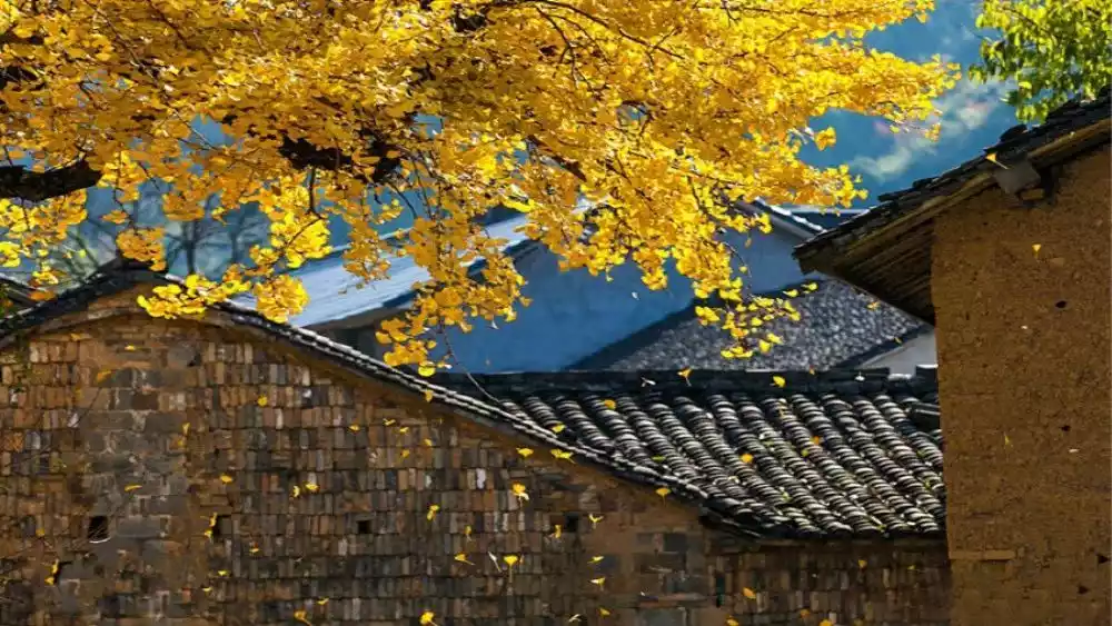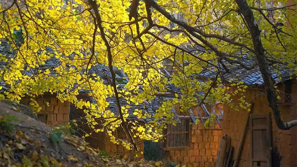 In autumn, ginkgo tree branches extend in all directions from paths, ridges, under house foundations, and stone steps, supporting the entire Tuole Village on the roots of the trees. The layers of green leaves in summer have all turned golden yellow.