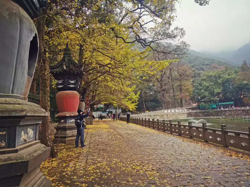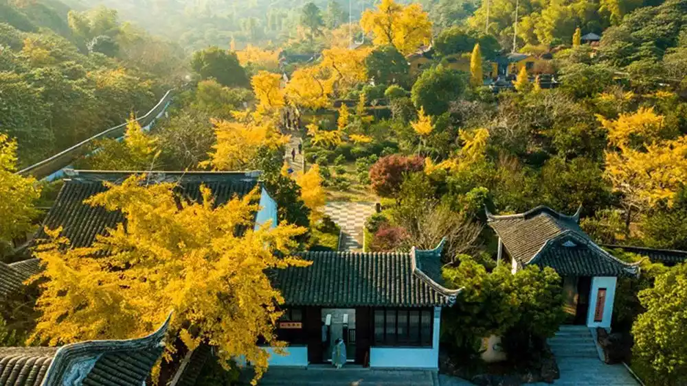 At Tiantong Temple, also located in Yinzhou District, the most stunning autumn scene is the seven ancient ginkgo trees lining Wangong Pond. Every autumn, the golden ginkgo trees attract waves of tourists seeking to admire the beauty of autumn.