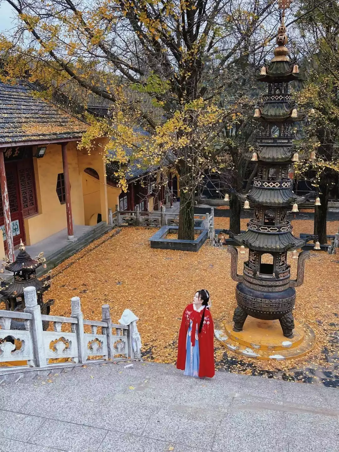 Tiantong Mountain, a southeastern Buddhist paradise nestled at the foot of Mount Taibai, is one of the "Five Zen Mountains of China," boasting over 1,700 years of history. In autumn, the golden ginkgo trees and falling leaves blend seamlessly, creating a vibrant atmosphere of autumn and Zen, bringing a touch of rain to the sky.