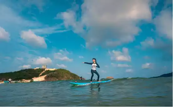 Surfing in Riyue Bay, step on the surfboard, move forward along the waves, and feel the rhythm of the waves.