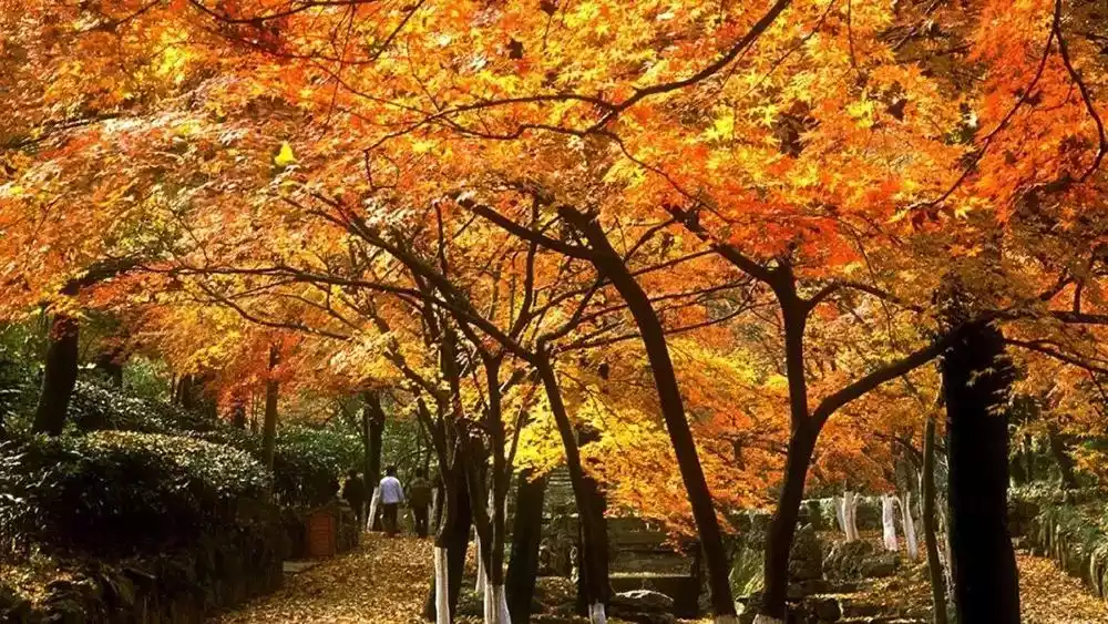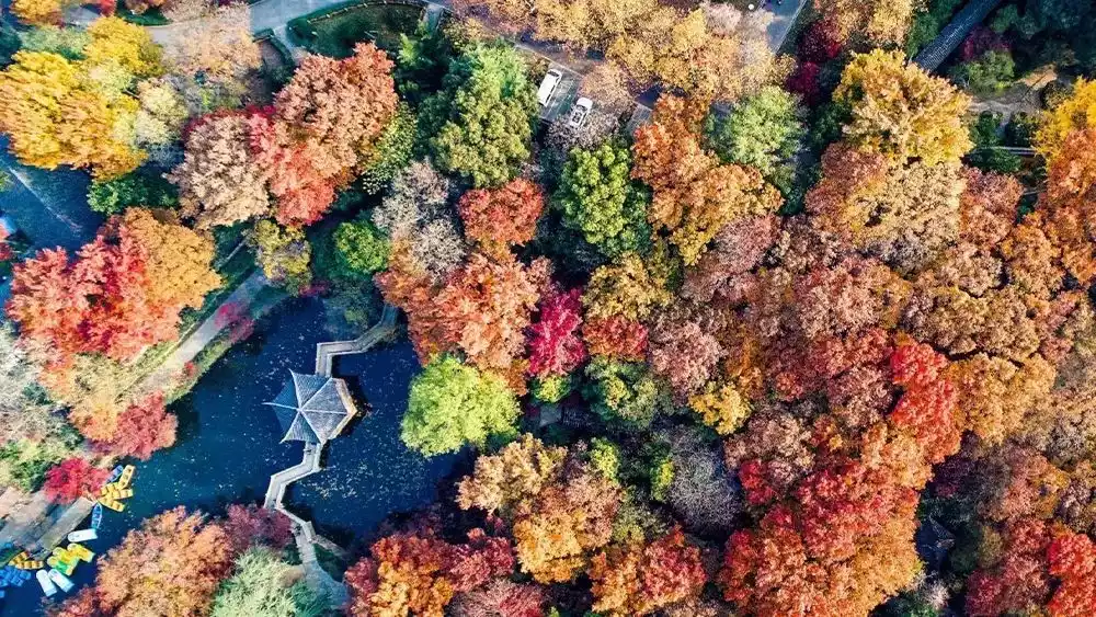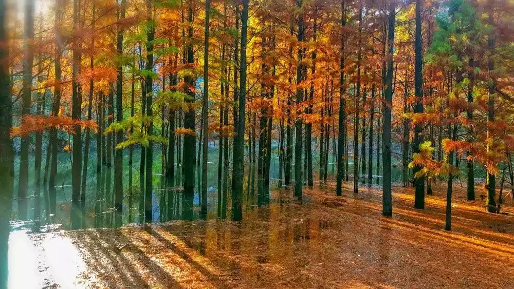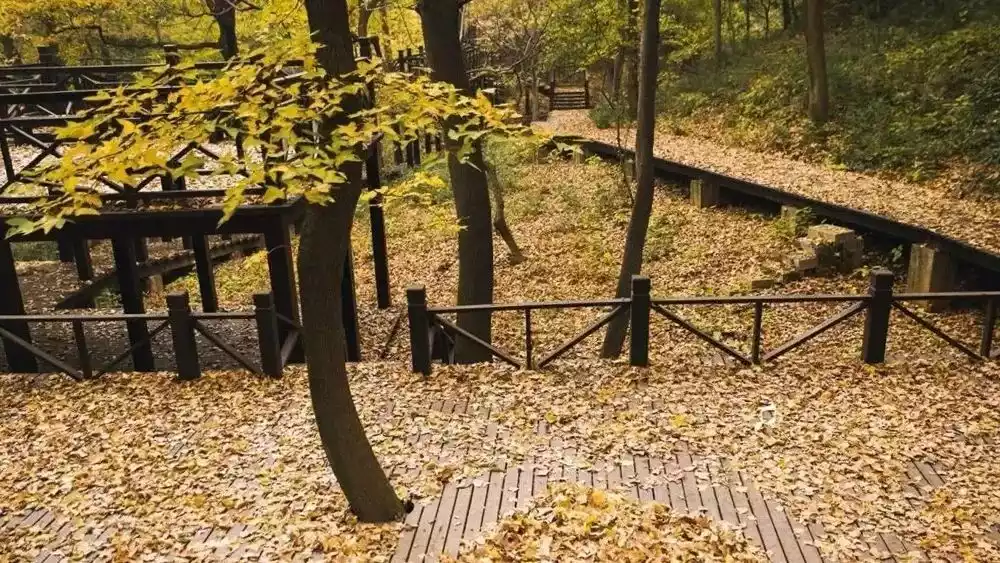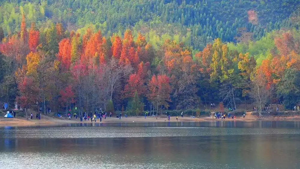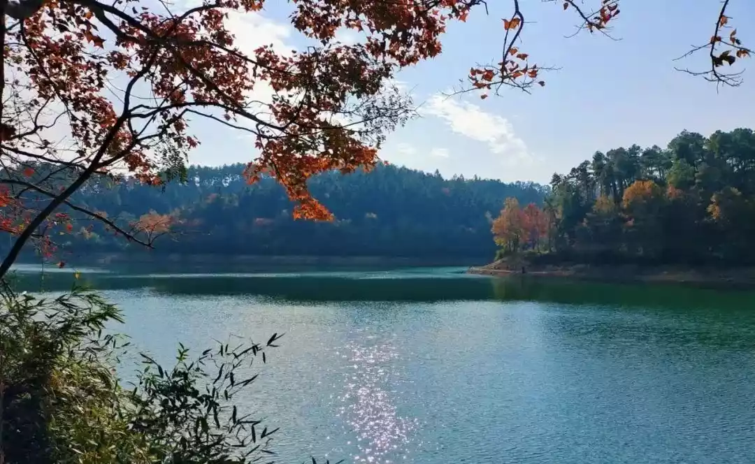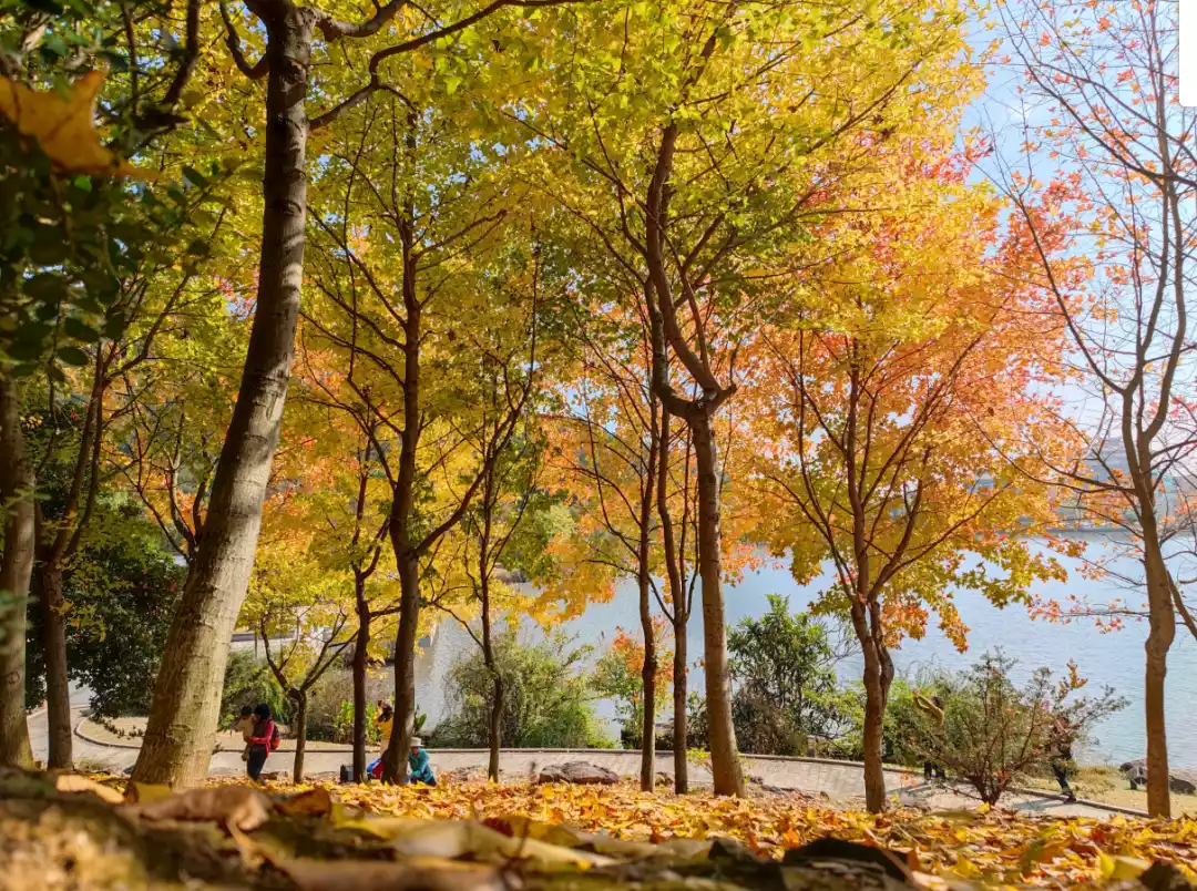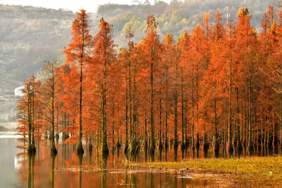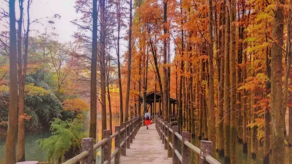Walking along the country road, you will reach the Ganling Lake Dam, where you will suddenly see the open air. The lake is covered with autumn colors and the waves are sparkling. The golden ginkgo trees, fiery red redwoods, colorful sweetgum trees and autumn leaves covering the ground make this place look like a fairy tale world.