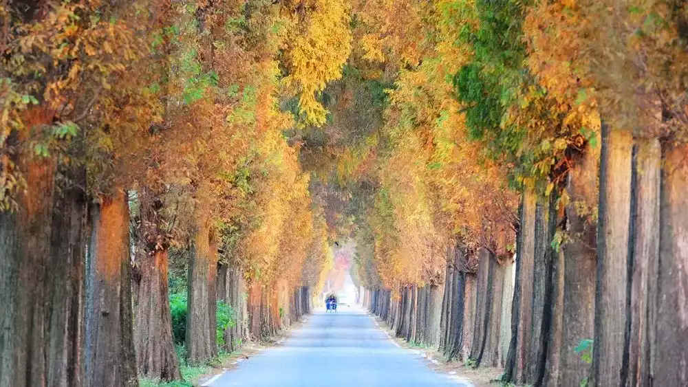 The fiery red Metasequoia trees and golden rice fields along the way are filled with the romantic charm of the countryside.