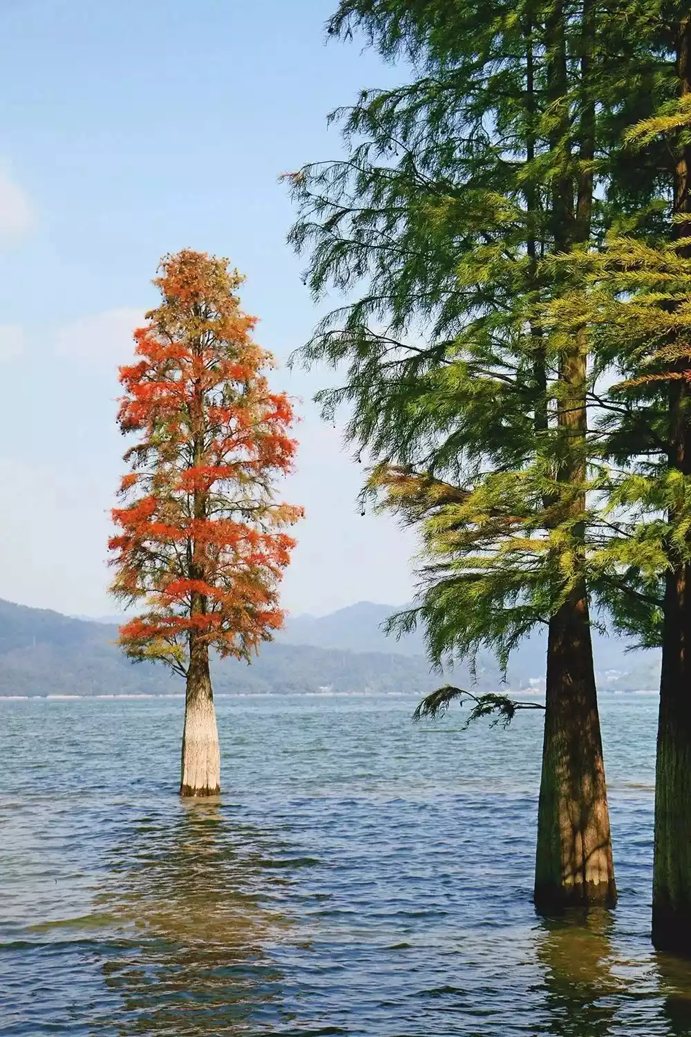 Arriving at the mountaintop reservoir, its mirror-like surface earned it the nickname "Little Jiuzhaigou" of Jiangnan. The Metasequoia leaves have already turned red, transforming into a redwood forest, creating an even more stunning scene under the sunlight. Xuedouling, such a poetic and dreamy name! The vibrant colors of the forest, the Metasequoia in full crimson, are a truly worthwhile journey!