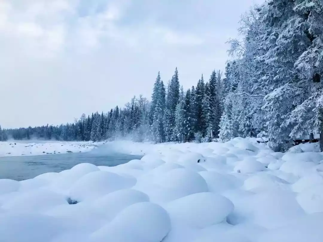 The snow mushrooms on the treetops and river banks look like freshly baked cream cakes, fluffy and soft, making people want to taste them.